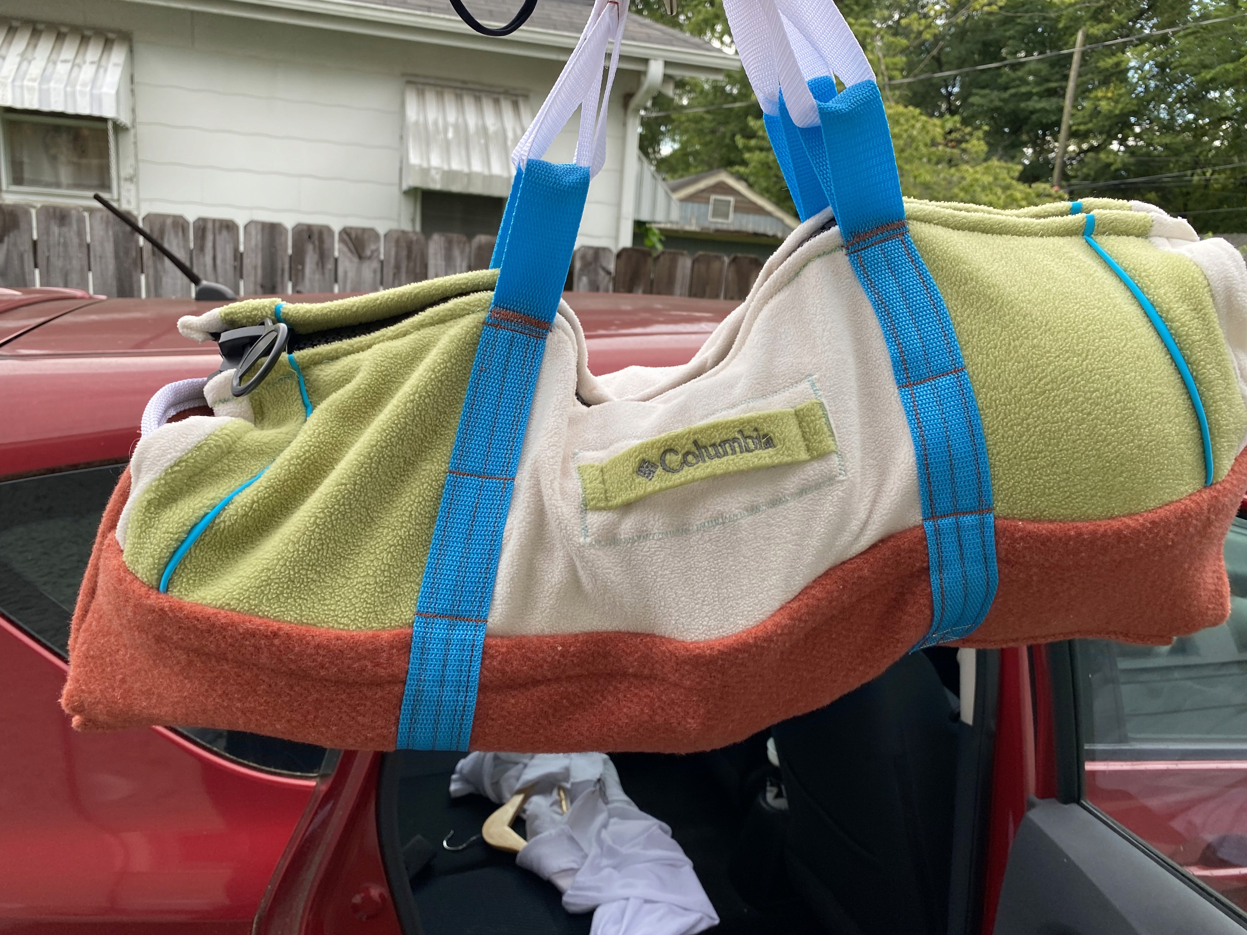 The final bag is made of fabric from three different jackets; a thick, synthetic wool for the bottom, and soft fleece for the top. I added nylon webbing to reinforce the sides and serve as carrying straps. And finally, I sewed on a large, #20 size zipper for the bag's closure.